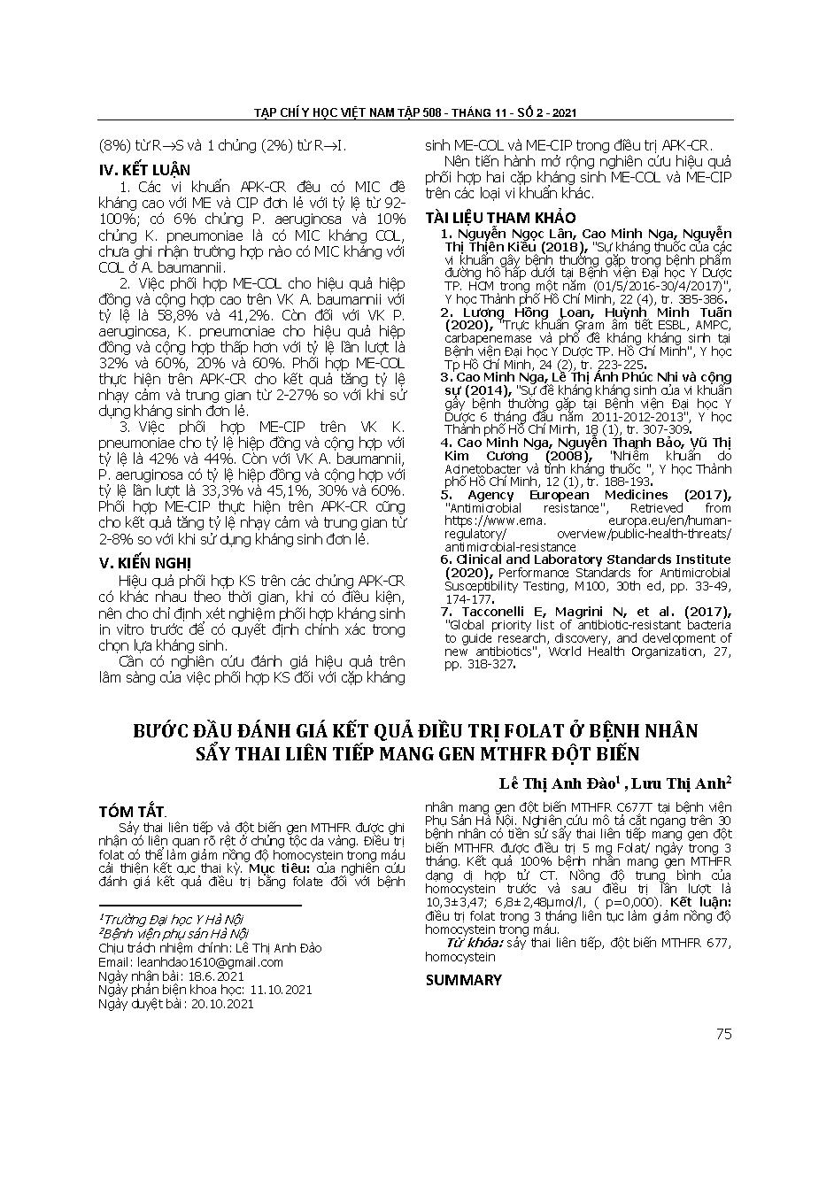 Bước đầu đánh giá kết quả điều trị folat ở bệnh nhân sẩy thai liên tiếp mang gen MTHFR đột biến = Initial step of assessing the result of folat treatment in recurrent pregnancy loss patients carrying the MTHFR mutated gene