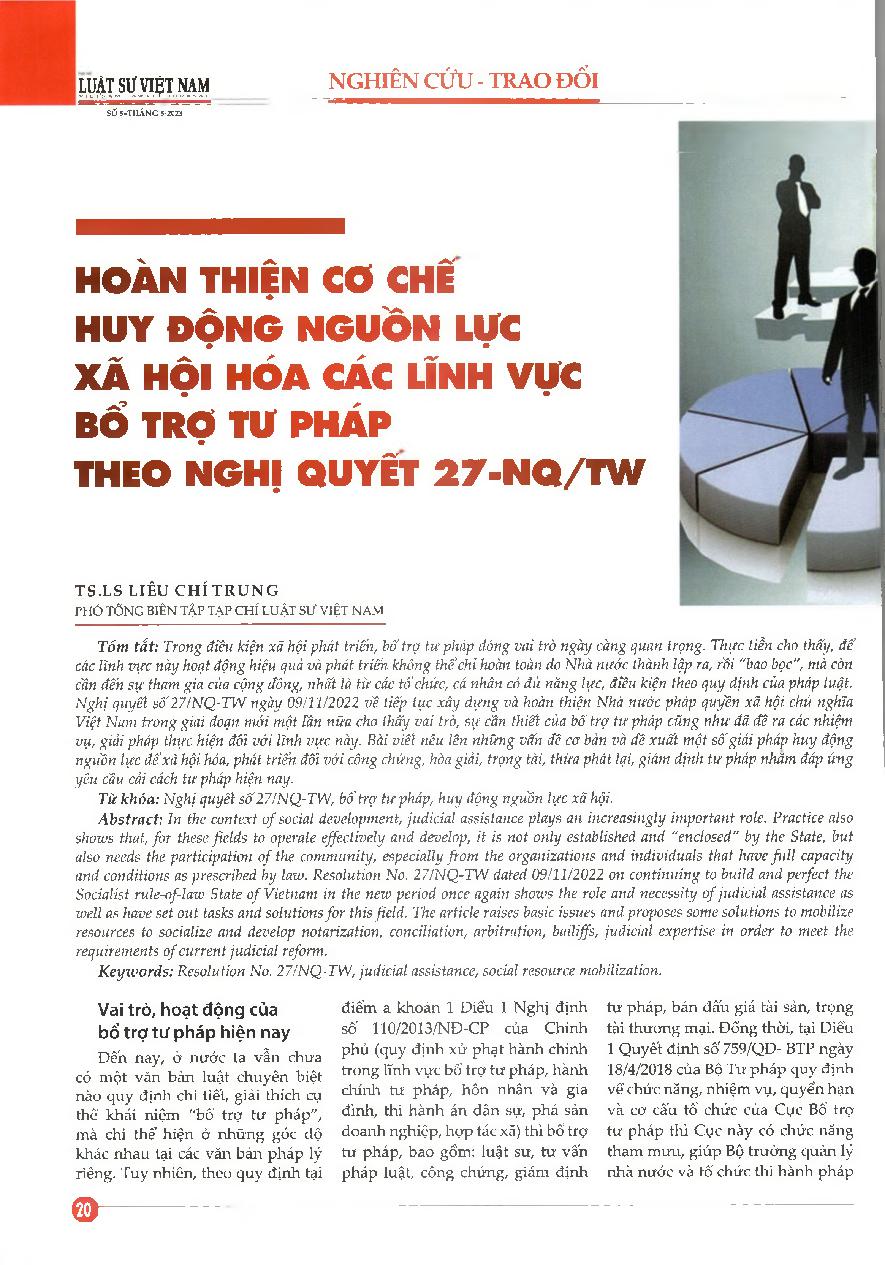 Hoàn thiện cơ chế huy động nguồn lực xã hội hóa các lĩnh vực bổ trợ tư pháp = Perfecting the mechanism for mobilizing resources of socialization in the fields of judicial assistance according to Resolution 27-NQ/TW