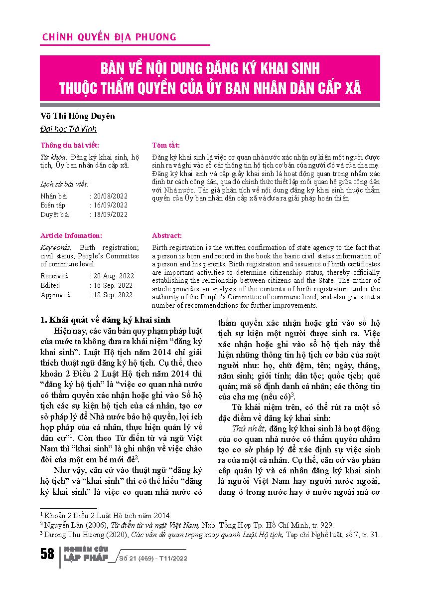 Bàn về nội dung đăng ký khai sinh thuộc thẩm quyền của ủy ban nhân dân cấp xã = Discussions on Contents of Birth Registration under Authority of People’s Committee of Commune Level