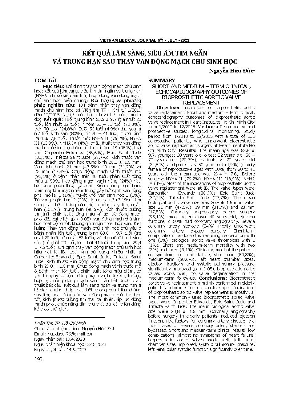 Kết quả lâm sàng, siêu âm tim ngắn và trung hạn sau thay van động mạch chủ sinh học = Short and medium - term clinical, echocardiography outcomes of bioprosthetic aortic valve replacement