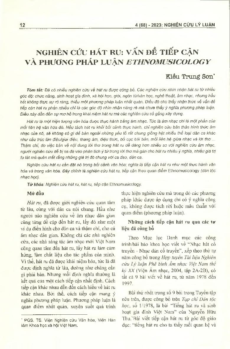 Nghiên cứu hát ru: vấn đề tiếp cận và phương pháp luận Ethnomusicology = Research on lullaby: Approach and Ethnomusicology methodologies