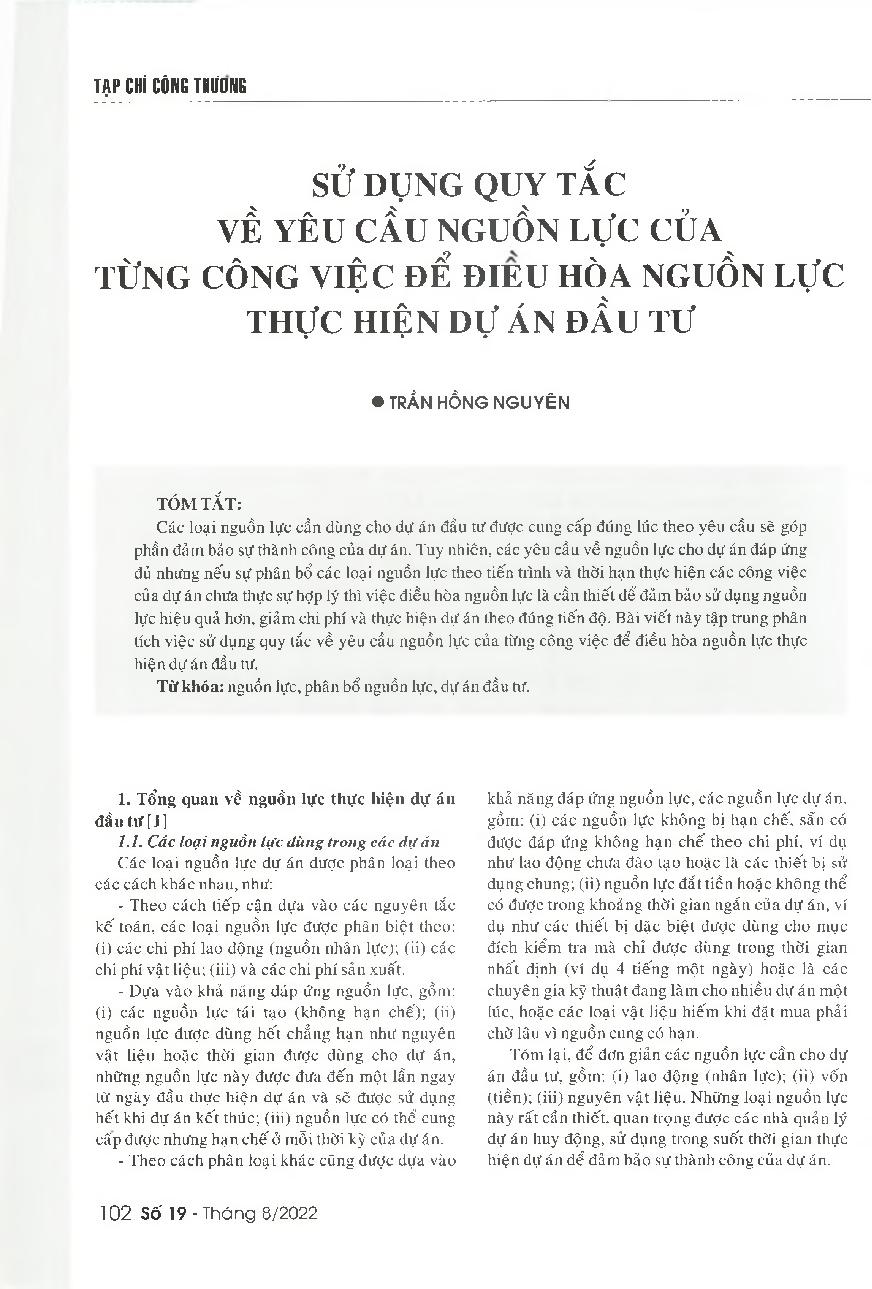 Sử dụng quy tắc về yêu cầu nguồn lực của từng công việc để điều hòa nguồn lực thực hiện dự án đầu tư = Using rules on resource requirements of each task in order to appropriately allocate resources in an investment project