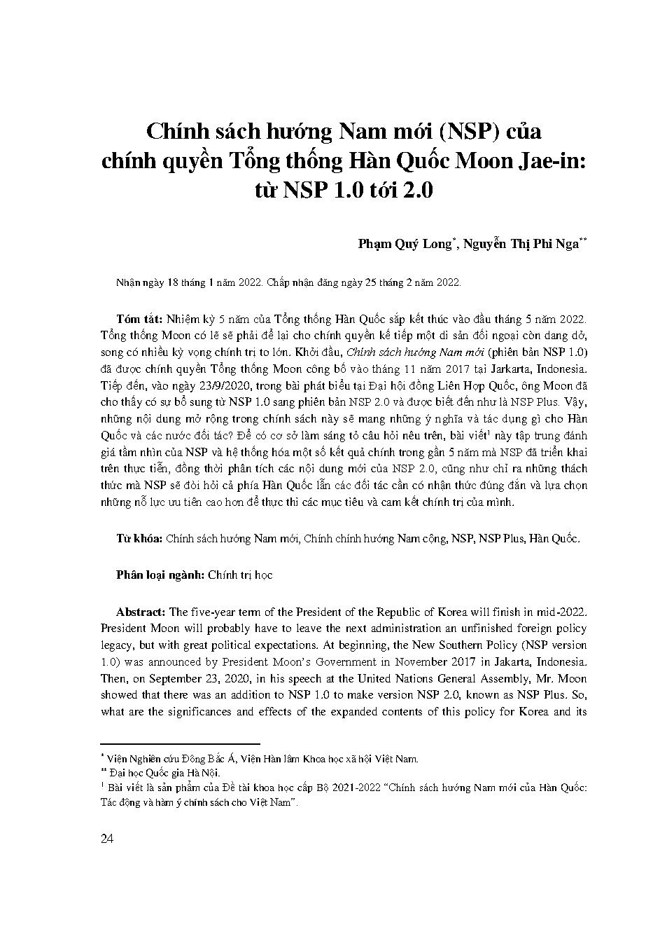 Chính sách hướng Nam mới (NSP) của chính quyền Tổng thống Hàn Quốc Moon Jae-in: từ NSP 1.0 tới 2.0 = New Southern Policy (NSP) of South Korean President Moon Jae-in’s administration: From NSP 1.0 to 2.0