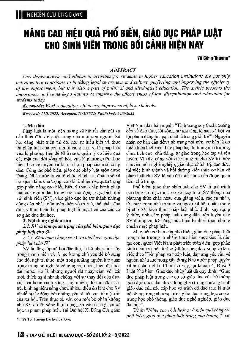 Nâng cao hiệu quả phổ biến, giáo dục pháp luật cho sinh viên trong bối cảnh hiện nay = Improving the effectiveness of law dissemination and education for students in the current context