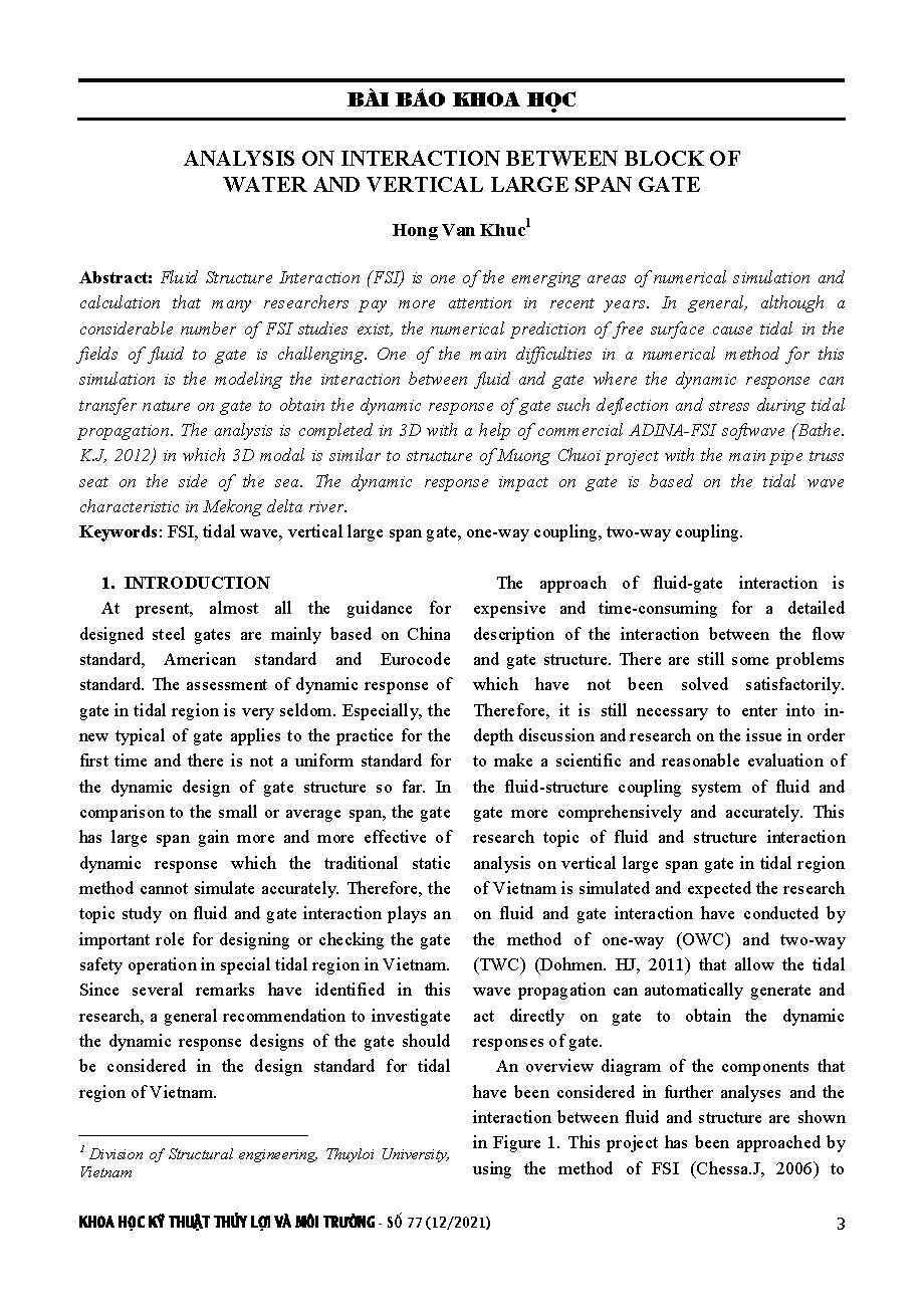 Phân tích tương tác giữa khối nước trước van và cửa van phẳng nhịp lớn bằng phương pháp fsi = Analysis on interaction between block of water and vertical large span gate