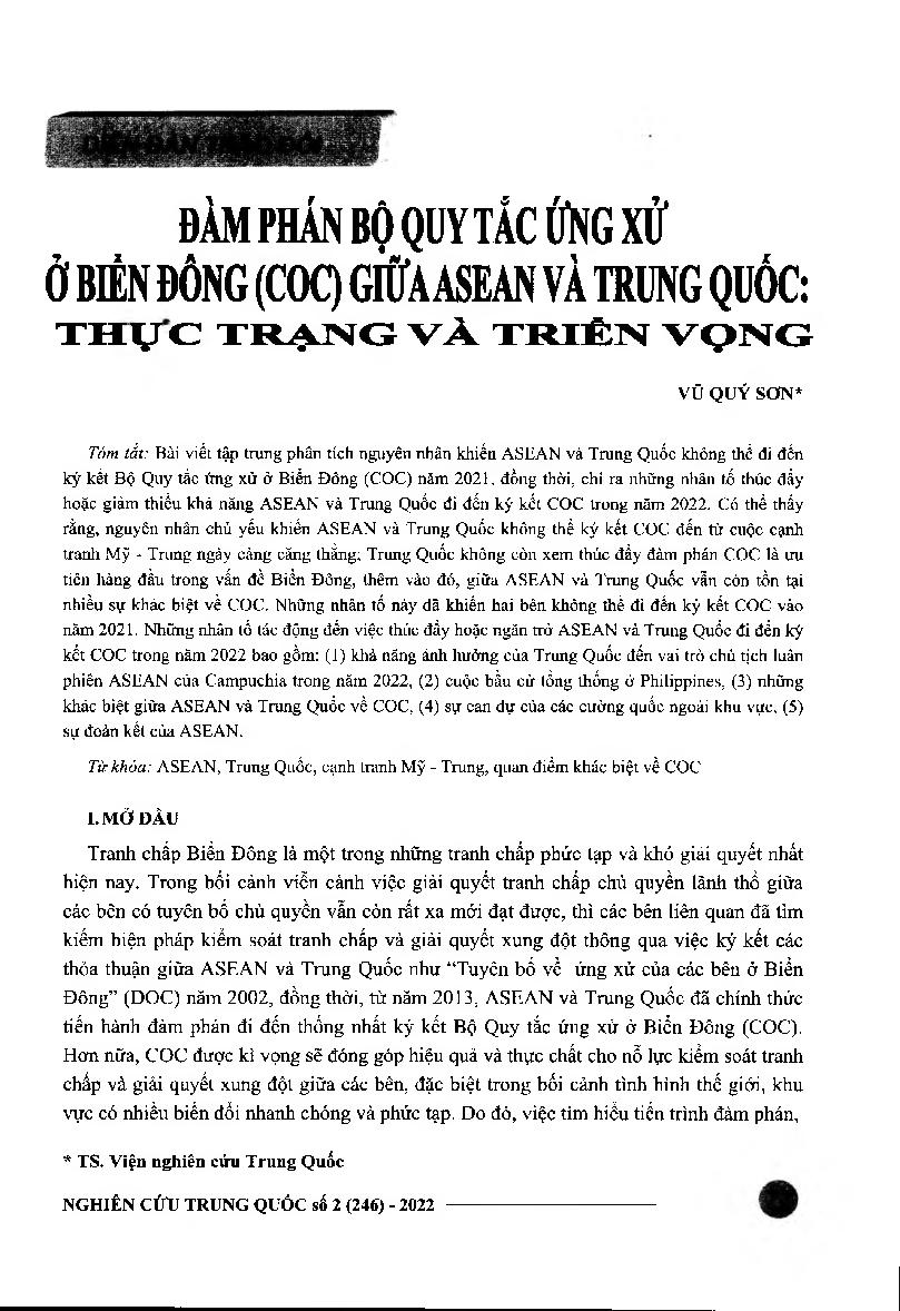 Đàm phán Bộ Quy tắc ứng xử ở Biển Đông (COC) giữa ASEAN và Trung Quốc: Thực trạng và triển vọng = Negotiation of the Code of Conduct in the East Sea (COC) between ASEAN and China: Current situation and outlook