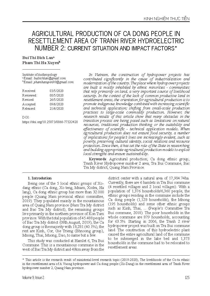 SẢN XUẤT NÔNG NGHIỆP CỦA NGƯỜI CA DONG Ở VÙNG TÁI ĐỊNH CƯ THỦY ĐIỆN SÔNG TRANH 2: THỰC TRẠNG VÀ NHỮNG YẾU TỐ TÁC ĐỘNG = AGRICULTURAL PRODUCTION OF CA DONG PEOPLE IN RESETTLEMENT AREA OF TRANH RIVER HYDROELECTRIC NUMBER 2: CURRENT SITUATION AND IMPACT FACTORS