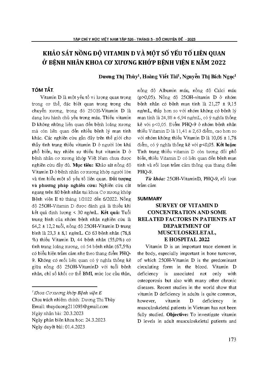 Khảo sát nồng độ vitamin d và một số yếu tố liên quan ở bệnh nhân khoa cơ xương khớp Bệnh viện E năm 2022