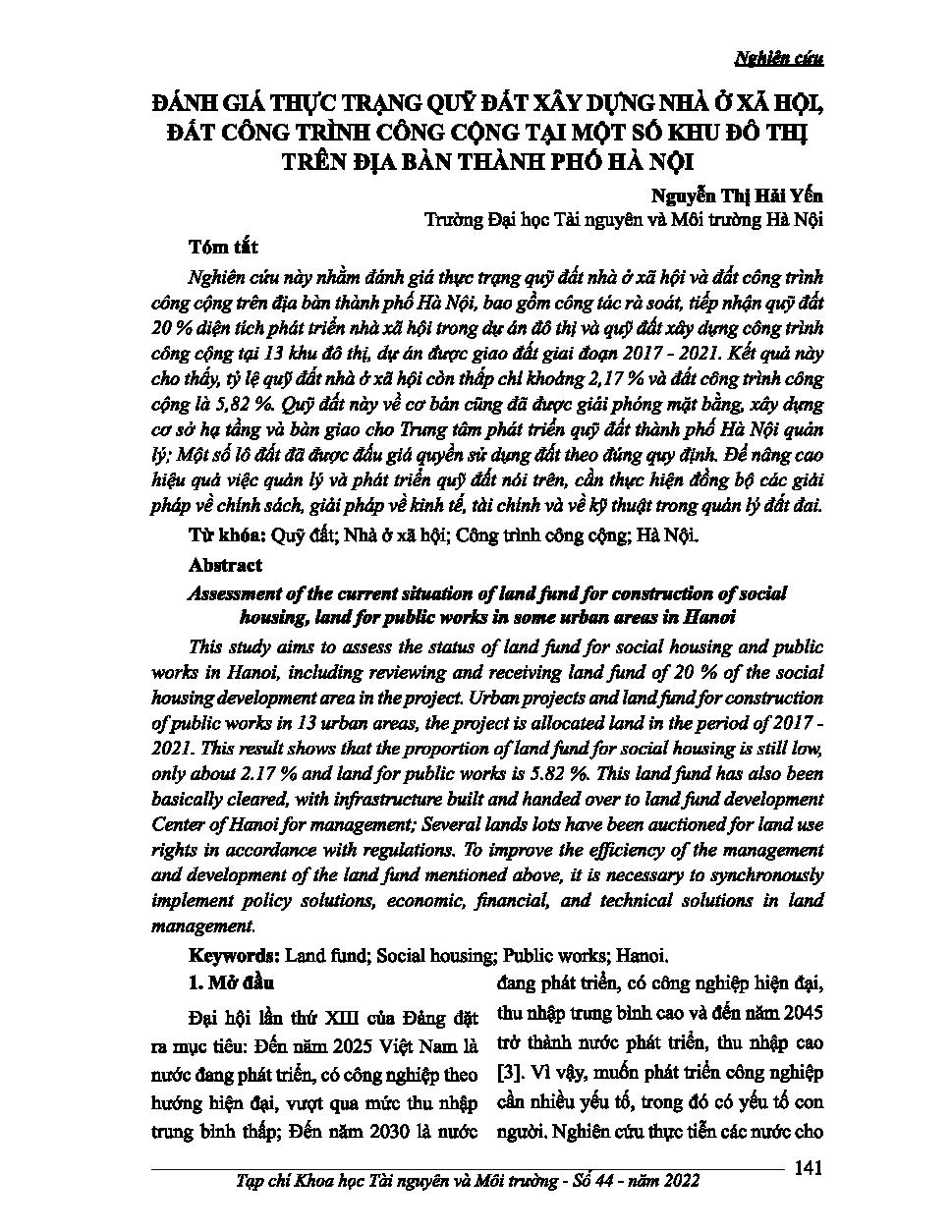 Đánh giá thực trạng quỹ đất xây dựng nhà ở xã hội, đất công trình công cộng tại một sô khu đô thị trên địa bàn thành phố Hà Nội = Assessment of the current situation o f land fund for construction of social housing, land for public works in some urban are
