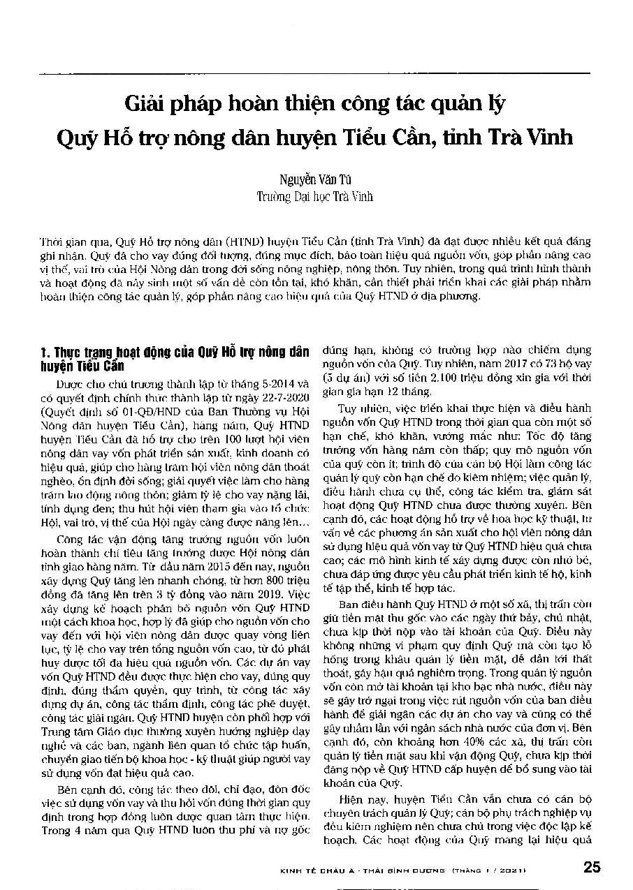 Giải pháp hoàn thiện công tác quản lý Quỹ Hỗ trợ nông dân huyện Tiểu Cần, tỉnh Trà Vinh