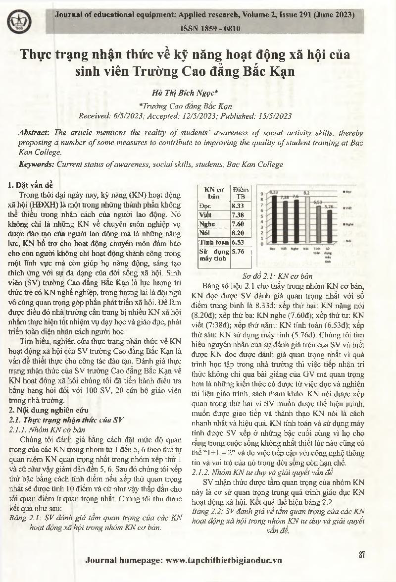 Thực trạng nhận thức về kỹ năng hoạt động xã hội của sinh viên Trường Cao đẳng Bắc Kạn = Current status of awareness about social activity skills of students at Bac Kan College