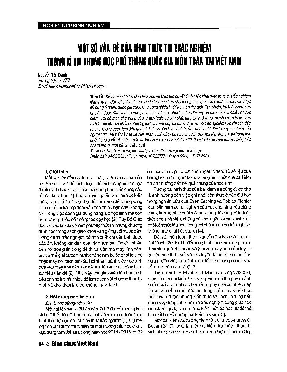Một số vấn đề của hình thức thi trắc nghiệm trong kỳ thi trung học phổ thông quốc gia môn toán tại Việt Nam = Some inadequacies of multiple-choice testing method for the Math exam of the National High School Exam in Vietnam