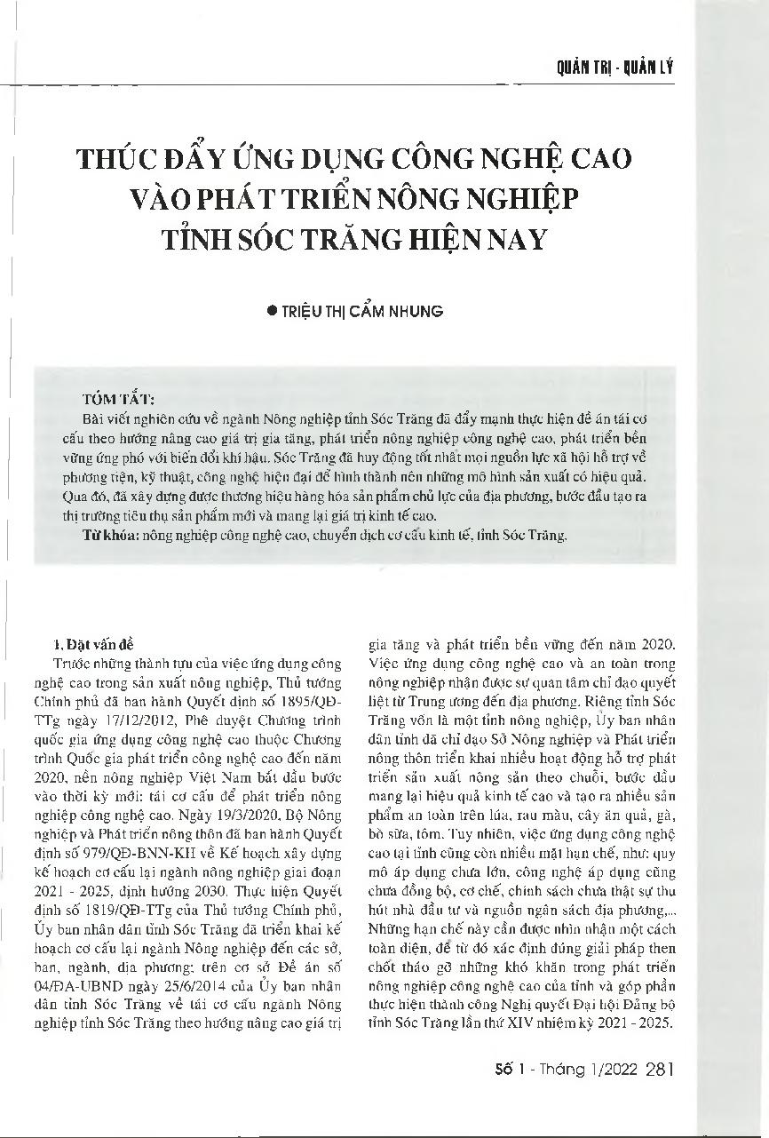 Thúc đẩy ứng dụng công nghệ cao vào phát triển nông nghiệp tỉnh Sóc Trăng hiện nay = Promoting the development of high-tech agricultural production in Soc Trang Province