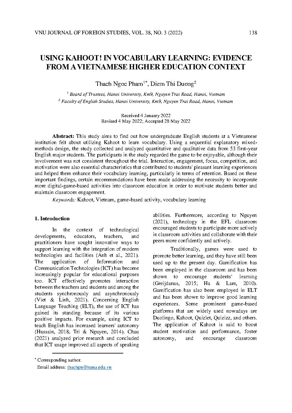 Sử dụng trò chơi Kahoot để học từ vựng: Nghiên cứu tại một trường Đại học ở Việt Nam = Using Kahoot! In vocabulary learning: Evidence from a Vietnamese higher education context