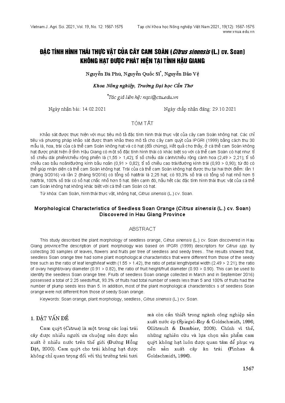 Đặc tính hình thái thực vật của cây cam Soàn (Citrus sinensis (L.) cv. Soan) không hạt được phát hiện tại tỉnh Hậu Giang = Morphological Characteristics of Seedless Soan Orange (Citrus sinensis (L.) cv. Soan) Discovered in Hau Giang Province