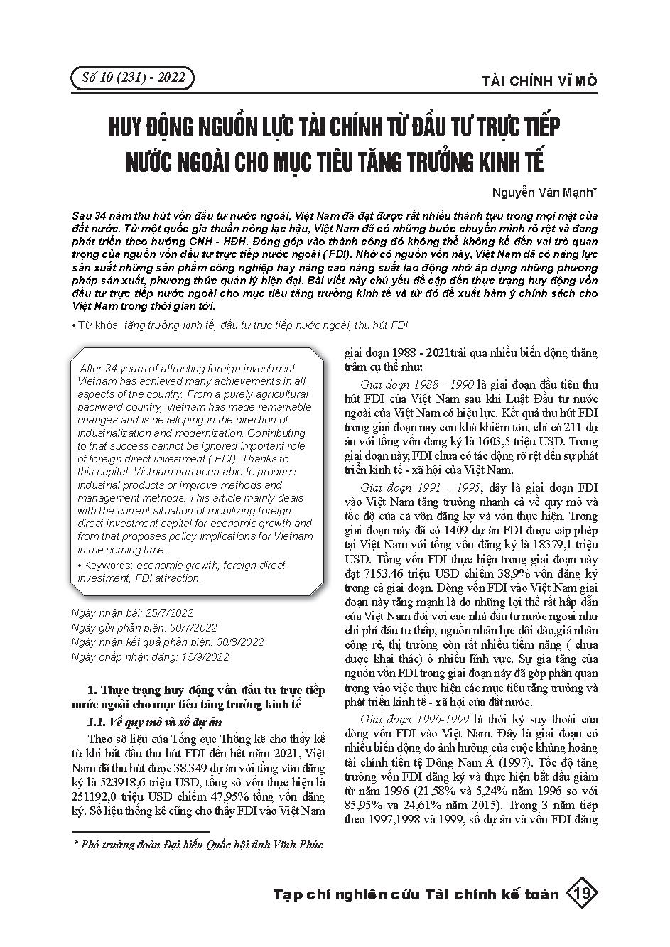 Huy động nguồn lực tài chính từ đầu tư trực tiếp nước ngoài cho mục tiêu tăng trưởng kinh tế = Mobilizing financial resources from foreign direct investment for economic growth