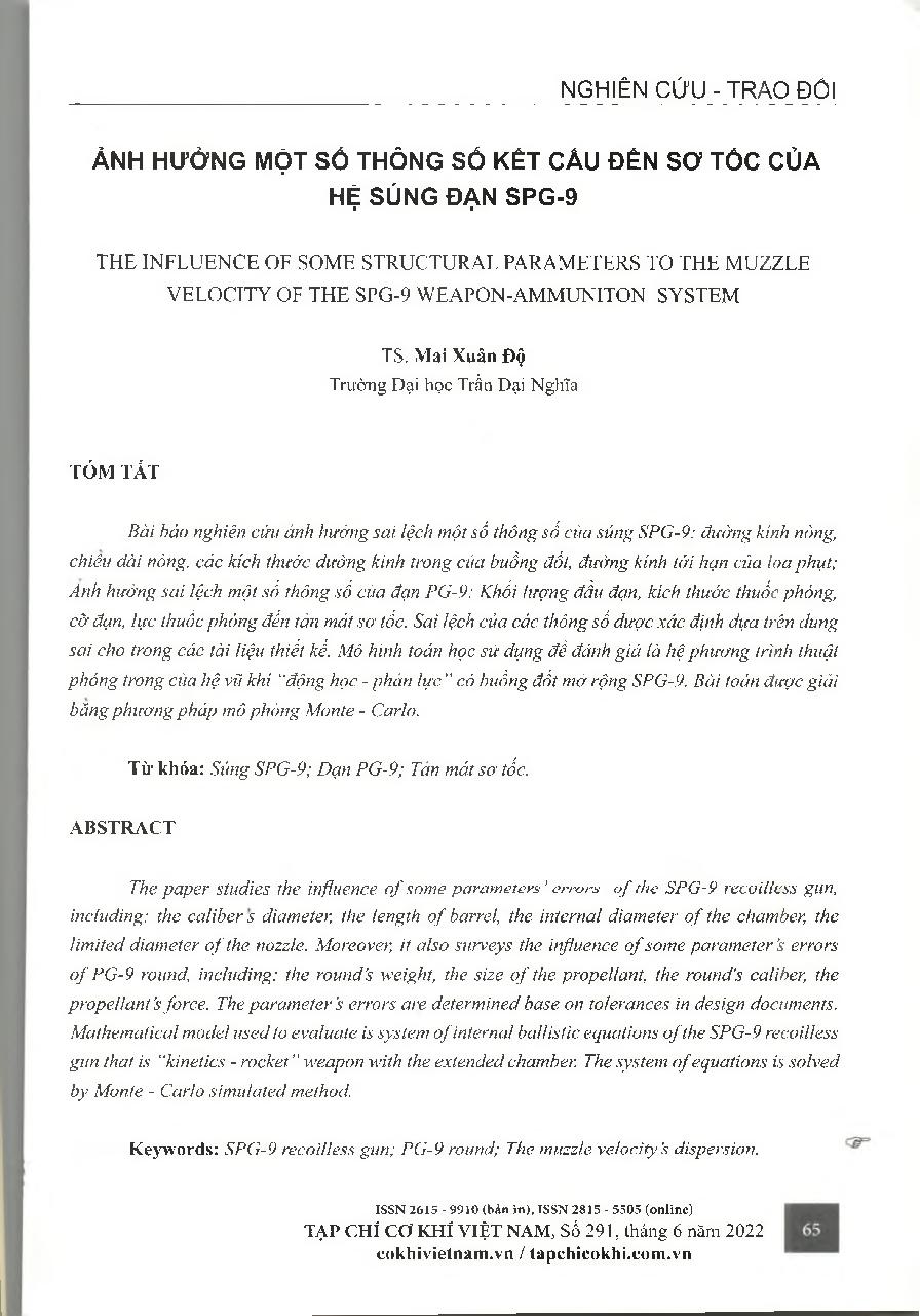 Ảnh hưởng một số thông số kết cấu đến sơ tốc của hệ súng đạn SPG-9 = The influence of some structural parameters to the muzzle velocity of the spg-9 weapon-ammuniton system