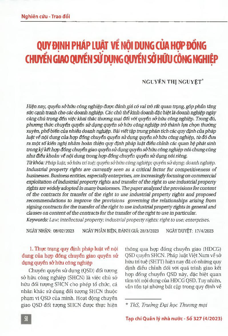 Quy định pháp luật về nội dung của hợp đồng chuyển giao quyền sử dụng quyền sở hữu công nghiệp = Legal regulations on the content of industrial property rights transfer contracts