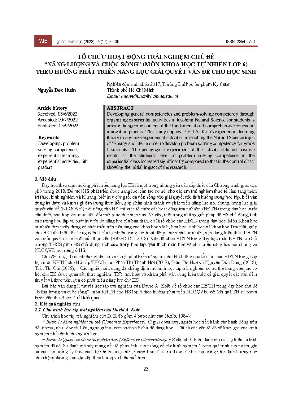 Tổ chức hoạt động trải nghiệm chủ đề “năng lượng và cuộc sống” (môn khoa học tự nhiên lớp 6) theo hướng phát triển năng lực giải quyết vấn đề cho học sinh = Organizing experiential activities with the theme "energy and life" (natural science subject in gr