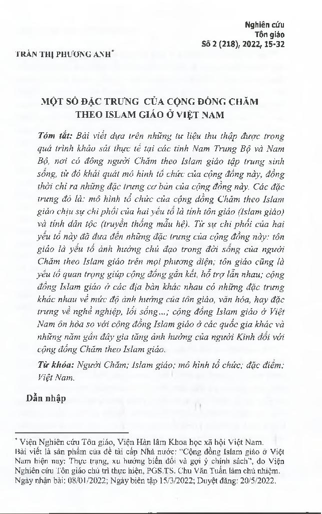 Một số đặc trưng của cộng đồng Chăm theo Islam giáo ở Việt Nam = Characteristics of the Cham muslim community in Vietnam