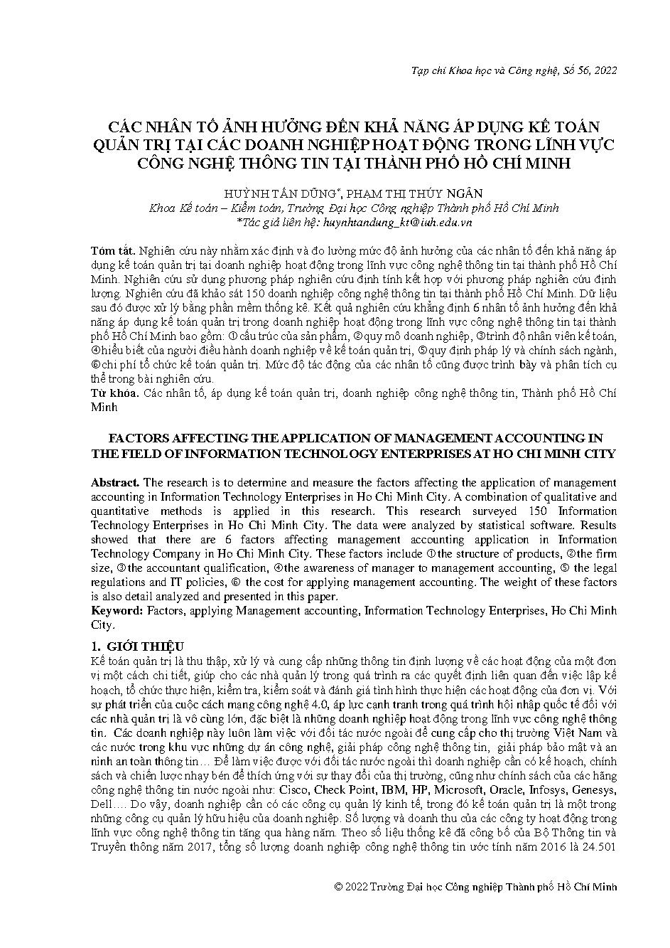 Các nhân tố ảnh hưởng đến khả năng áp dụng kế toán quản trị tại các doanh nghiệp hoạt động trong lĩnh vực công nghệ thông tin tại thành phố Hồ Chí Minh = Factors affecting the application of management accounting in the field of information technology ent