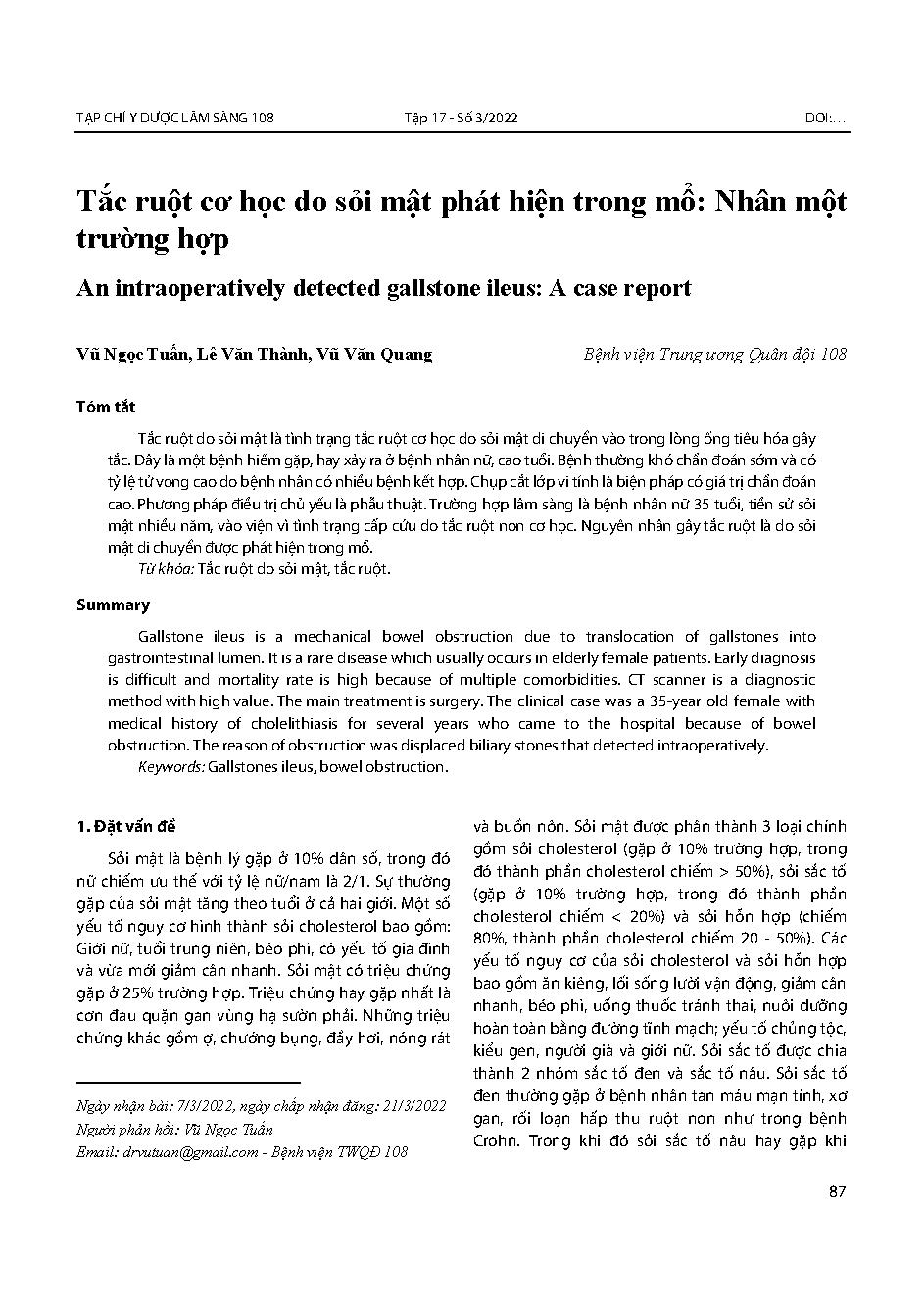 Tắc ruột cơ học do sỏi mật phát hiện trong mổ: Nhân một trường hợp = An intraoperatively detected gallstone ileus: A case report
