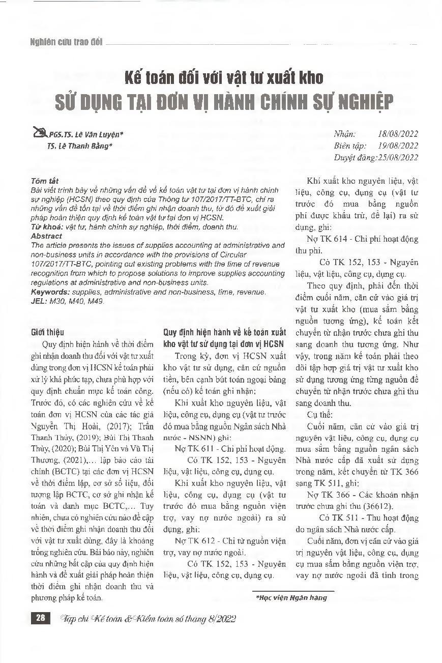 Kế toán đối với vật tư xuất kho sử dụng tại đơn vị hành chính sự nghiệp = Accounting of revenue for exporting supplies used at the administrative and non-business units