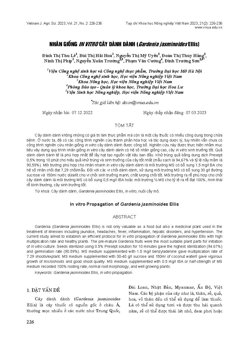 Nhân giống in vitro cây dành dành (Gardenia jasminoides Ellis)
