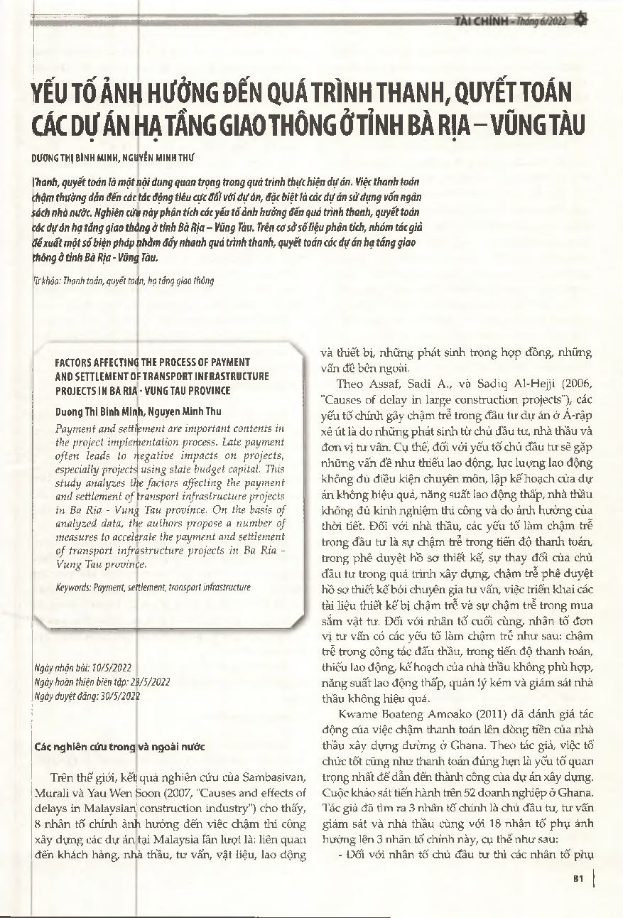 Yếu tố ảnh hưởng đến quá trình thanh, quyết toán các dự án hạ tầng giao thông ở tỉnh Bà Rịa-Vũng Tàu = Factors affecting the process of payment and settlement of transport infrastructure projects in Ba Ria - Vung Tau province