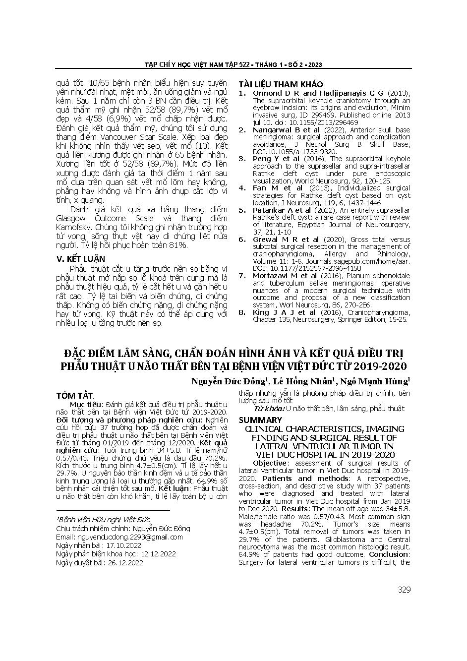 Đặc điểm lâm sàng, chẩn đoán hình ảnh và kết quả điều trị phẫu thuật u não thất bên tại Bệnh viện Việt Đức từ 2019-2020 = Clinical characteristics, imaging finding and surgical result of lateral ventricular tumor in Viet Duc hospital in 2019-2020