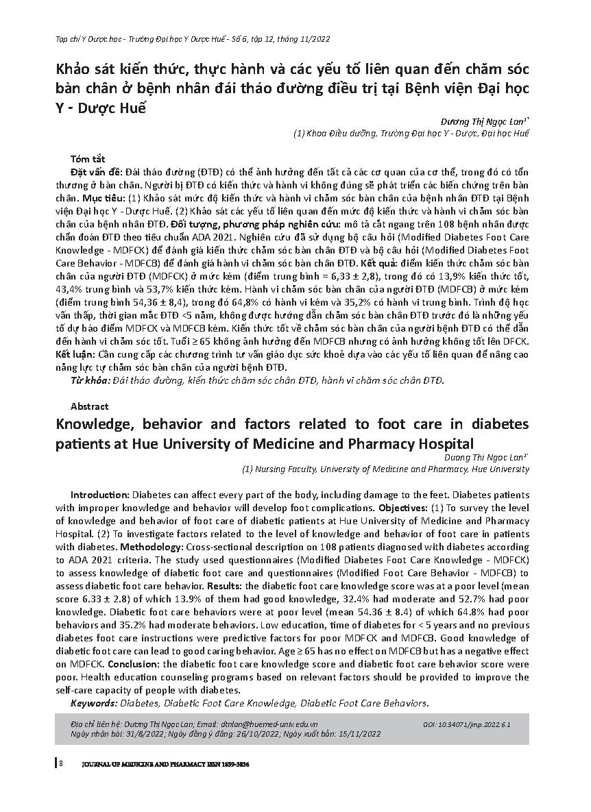Khảo sát kiến thức, thực hành và các yếu tố liên quan đến chăm sóc bàn chân ở bệnh nhân đái tháo đường điều trị tại Bệnh viện Đại học Y - Dược Huế = Knowledge, behavior and factors related to foot care in diabetes patients at Hue University of Medicine an