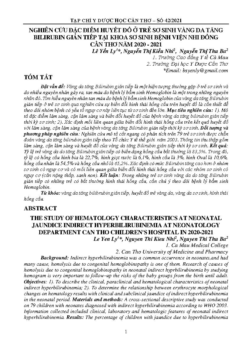 NGHIÊN CỨU ĐẶC ĐIỂM HUYẾT ĐỒ Ở TRẺ SƠ SINH VÀNG DA TĂNG BILIRUBIN GIÁN TIẾP TẠI KHOA SƠ SINH BỆNH VIỆN NHI ĐỒNG CẦN THƠ NĂM 2020 - 2021 = THE STUDY OF HEMATOLOGY CHARACTERISTICS AT NEONATAL JAUNDICE INDIRECT HYPERBILIRUBINEMIA AT NEONATOLOGY DEPARTMENT CAN THO CHILDREN'S HOSPITAL IN 2020-2021