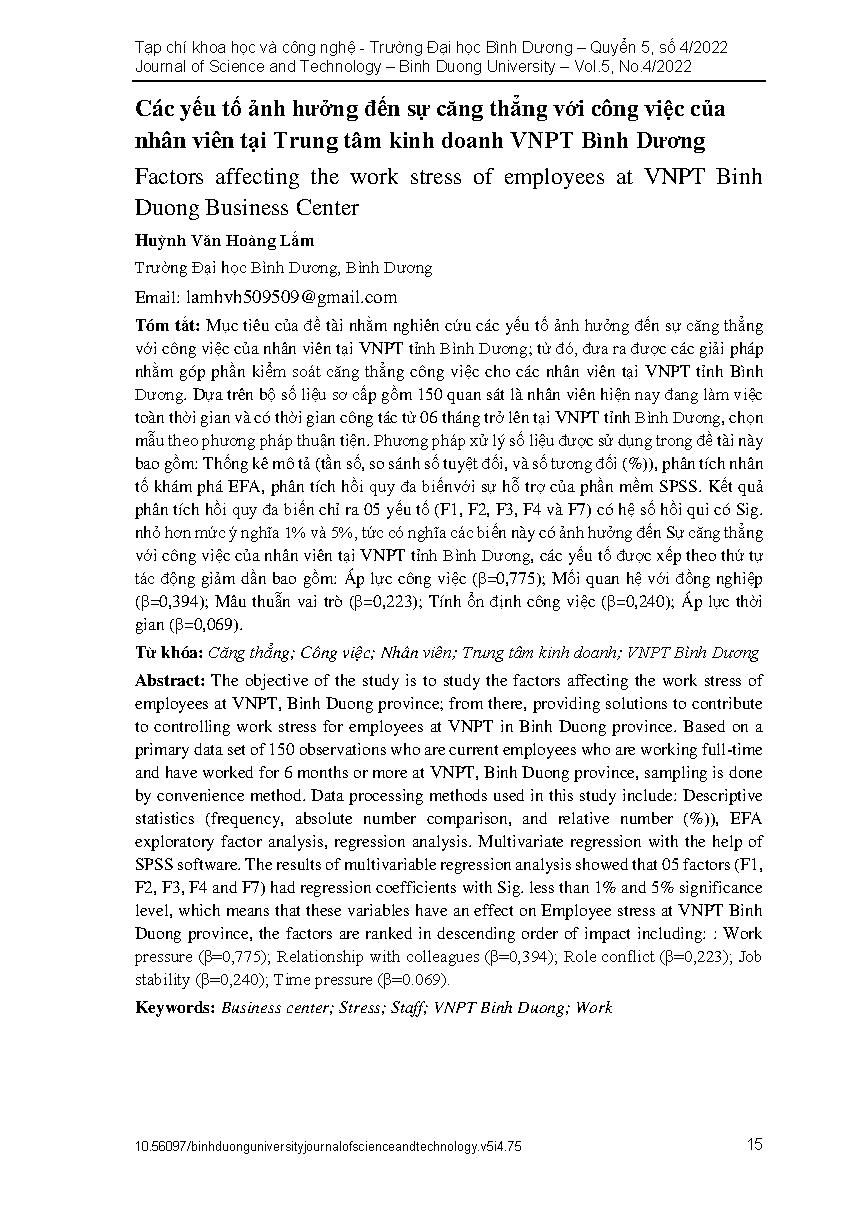 Các yếu tố ảnh hưởng đến sự căng thẳng với công việc của nhân viên tại Trung tâm kinh doanh VNPT Bình Dương = Factors affecting the work stress of employees at VNPT Binh Duong Business Center