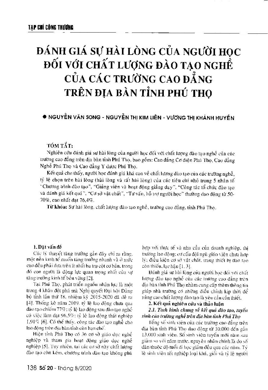 Đánh giá sự hài lòng của người học đối với chất lượng đào tạo nghề của các trường cao đẳng trên địa bàn tỉnh Phú Thọ = Assessment of student's satisfaction with the quality vocational training of colleges in Phu Tho Province