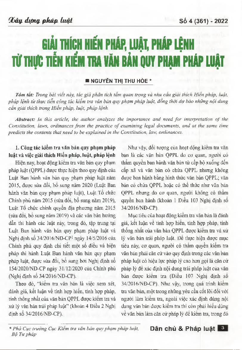 Giải thích Hiến pháp, luật, pháp lệnh từ thực tiễn kiểm tra văn bản quy phạm pháp luật = Interpretation of the Constitution, laws and ordinances from the practice of examining legal documents