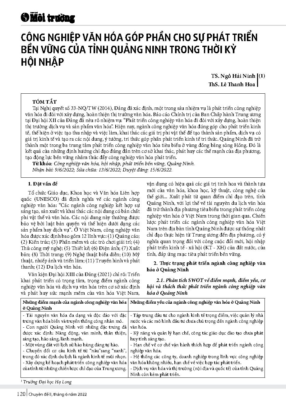 Công nghiệp văn hóa góp phần cho sự phát triển bền vững của tỉnh Quảng Ninh trong thời kỳ hội nhập = Cultural industry contributes to sustainable development of Quang Ninh province in the integration period
