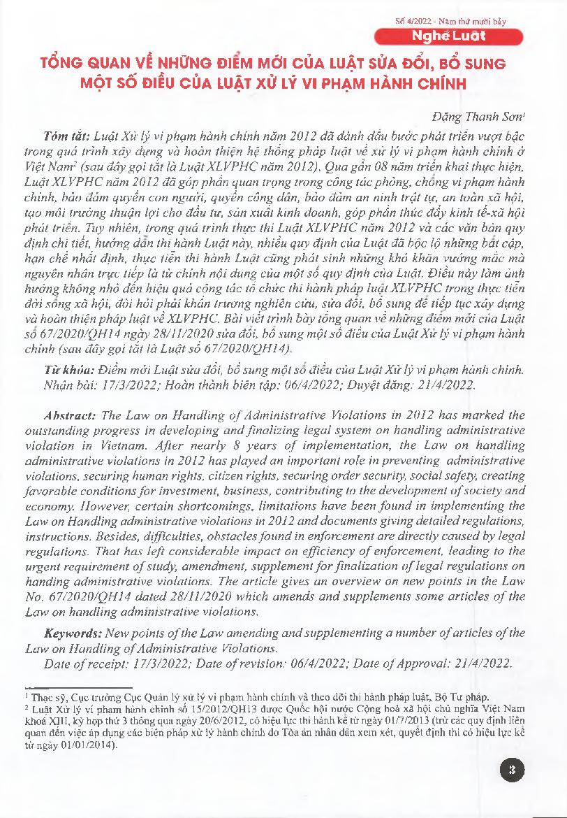 Tổng quan về những điểm mới của Luật sửa đổi, bổ sung một số điều của Luật Xử lý vi phạm hành chính = Overview on new points of the Law amending, supplementing some articles of the Law on Handling administrative violations