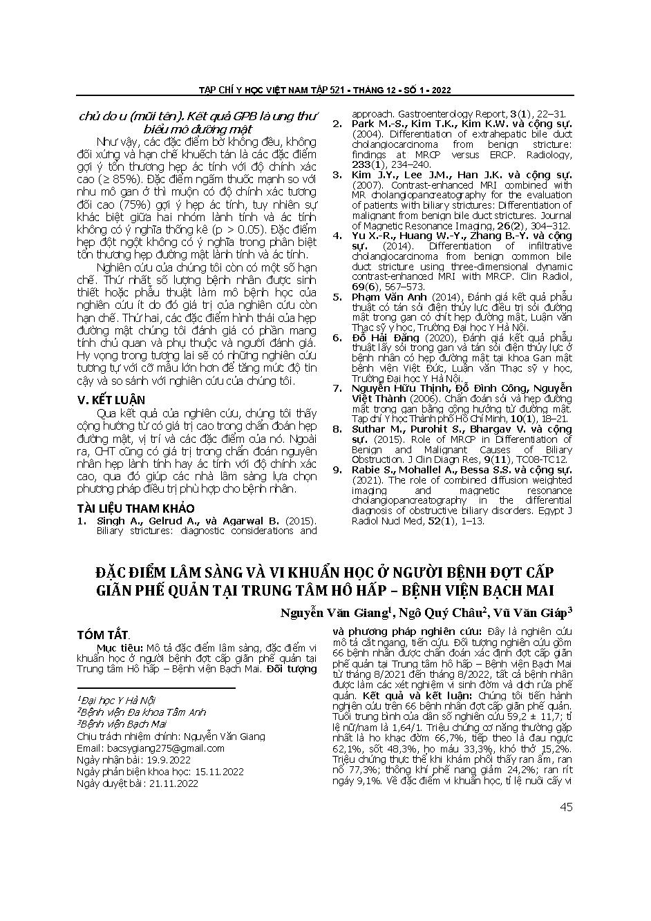 Đặc điểm lâm sàng và vi khuẩn học ở người bệnh đợt cấp giãn phế quản tại trung tâm hô hấp – Bệnh viện Bạch Mai = Clinical characteristics and bacteriology in exacerbation of bronchiectasis patients at the respiratory center in Bach Mai hospital