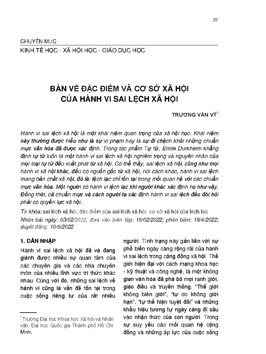 Bàn về đặc điểm và cơ sở xã hội của hành vi sai lệch xã hội = Discussion on the characteristics and social foundations of the social deviant behaviour
