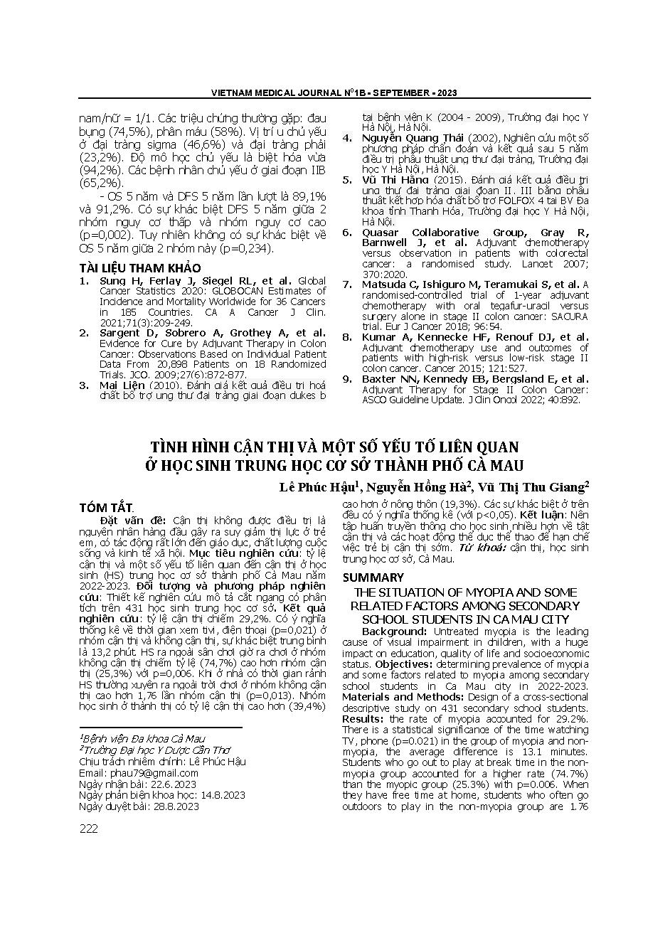 Tình hình cận thị và một số yếu tố liên quan ở học sinh trung học cơ sở thành phố Cà Mau = The situation of myopia and some related factors among secondary school students in Ca Mau city