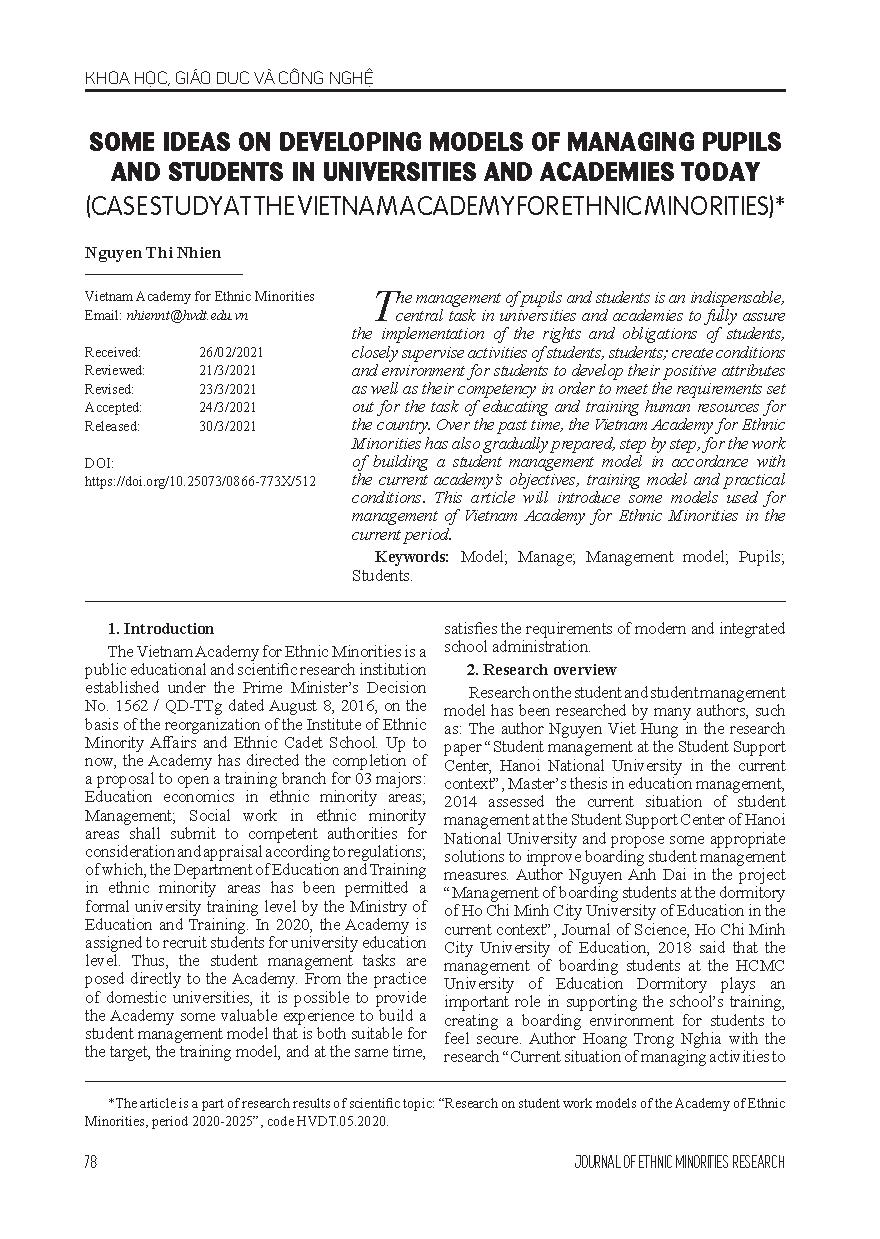 Một số mô hình quản lý học sinh, sinh viên trong các trường đại học, học viện hiện nay (nghiên cứu trường hợp học viện dân tộc) = Some ideas on developing models of managing pupils and students in universities and academies today (case study at the vietnam academy for ethnic minorities)