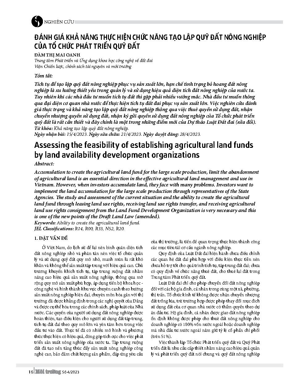Đánh giá khả năng thực hiện chức năng tạo lập quỹ đất nông nghiệp của tổ chức phát triển quỹ đất = Assessing the feasibility of establishing agricultural land funds by land availability development organizations