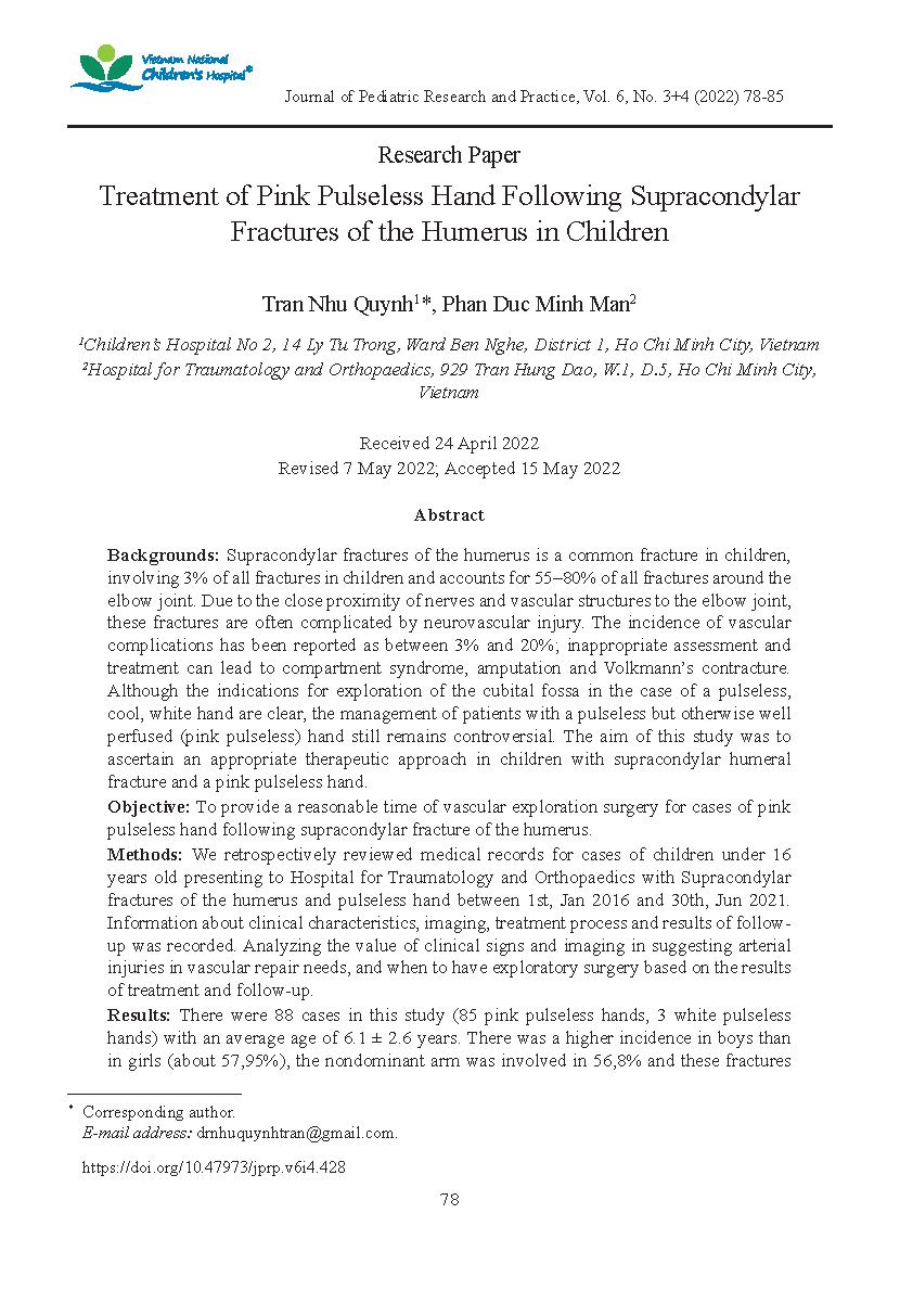 Điều trị các trường hợp bàn tay hồng mất mạch trong gãy trên lồi cầu xương cánh tay trẻ em = Treatment of Pink Pulseless Hand Following Supracondylar Fractures of the Humerus in Children