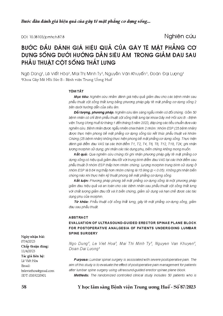 Bước đầu đánh giá hiệu quả của gây tê mặt phẳng cơ dựng sống dưới hướng dẫn siêu âm trong giảm đau sau phẫu thuật cột sống thắt lưng = Evaluation of ultrasound-guided erector spinae plane block for postoperative analgesia of patients undergoing lumbar spi
