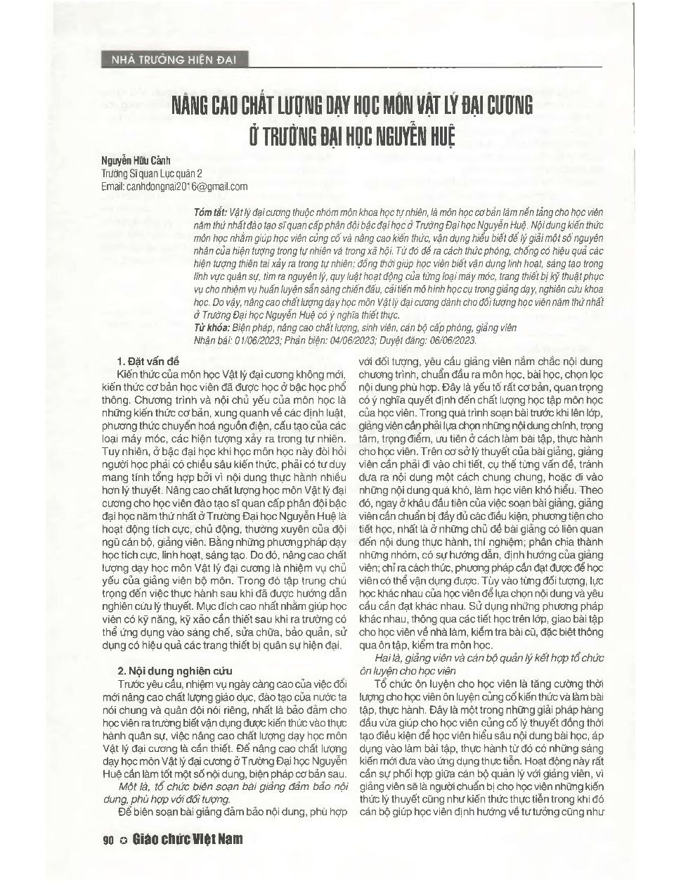 Nâng cao chất lượng dạy học môn Vật lý đại cương ở Trường Đại học Nguyễn Huệ