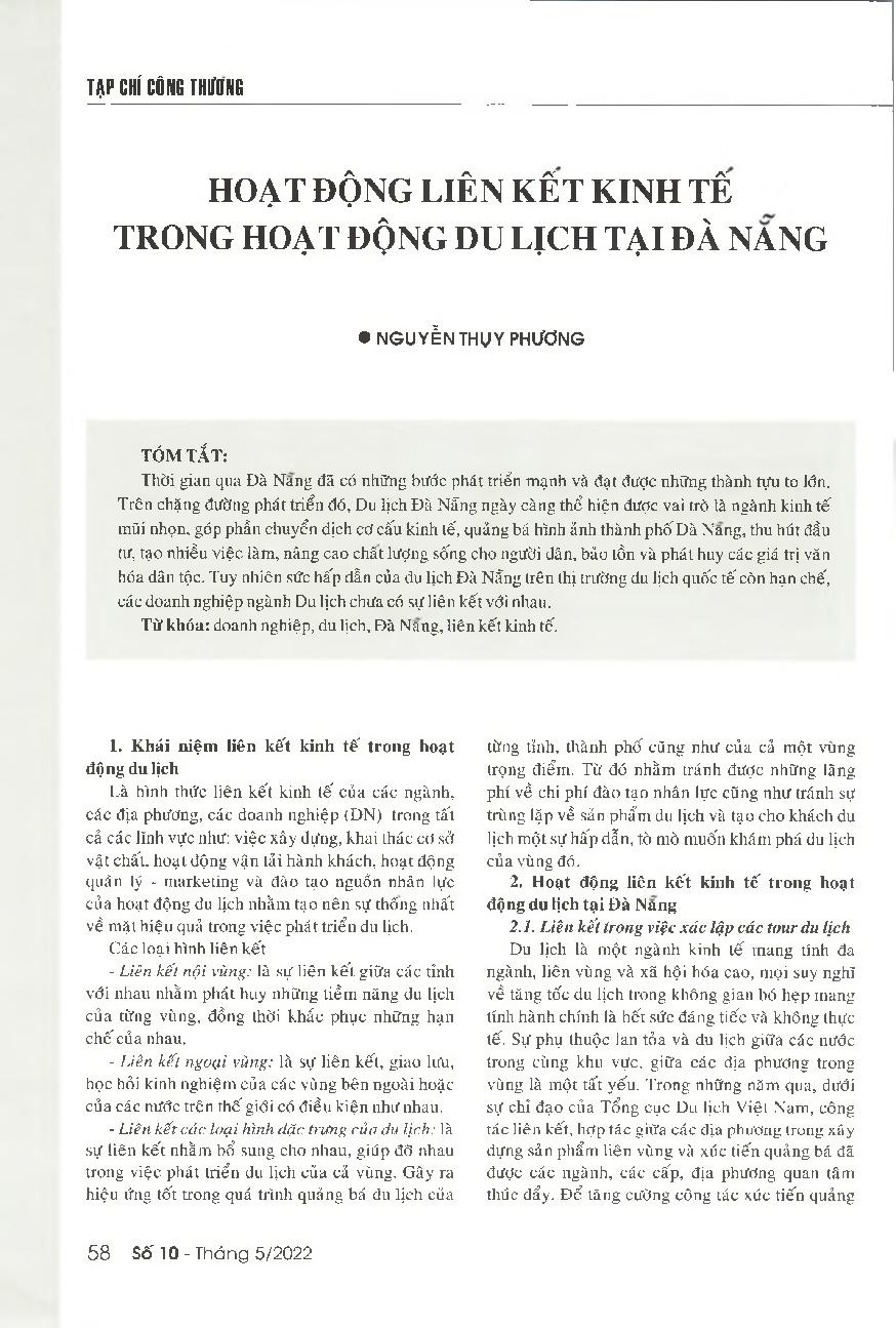 Hoạt động liên kết kinh tế trong hoạt động du lịch tại Đà Nẵng = Economic links in Da Nang city&; 39;s tourism activities