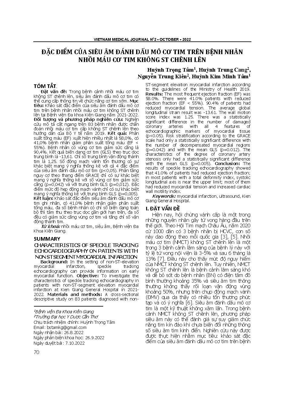 Đặc điểm của siêu âm đánh dấu mô cơ tim trên bệnh nhân nhồi máu cơ tim không ST chênh lên = Characteristics of speckle tracking echocardiography on patients with non ST segment myocardial infarction