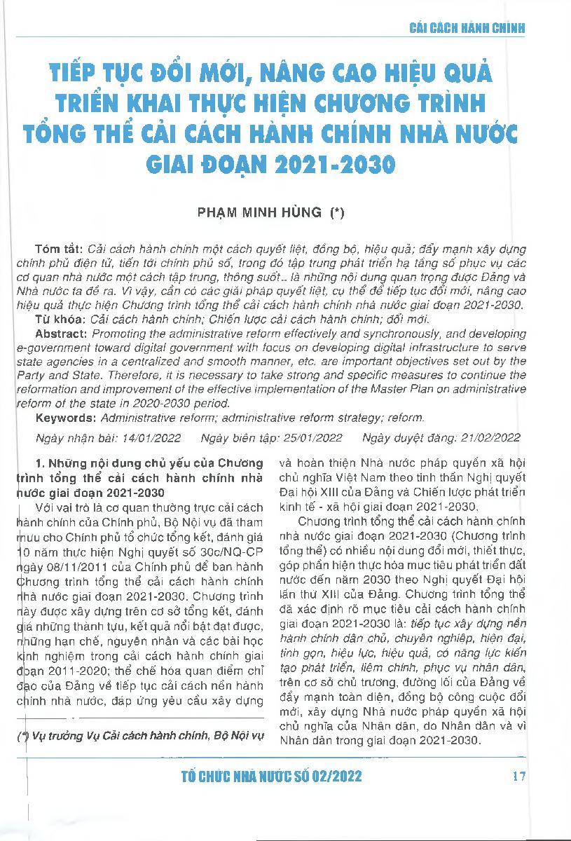 Tiếp tục đổi mới, nàng cao hiệu quả triển khai thực hiện chương trình tổng thể cải cách hành chính nhà nước giai đoạn 2021-2030 = Continuing the reformation and improvement of the effective implementation of the Master Plan on administrative reform of the
