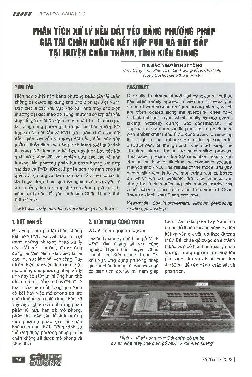 Phân tích xử lý nền đất yếu bằng phương pháp gia tải chân không kết hợp pvd và đất đắp tại huyện Châu Thành, tỉnh Kiên Giang = Analyzing treatment of soft soils by vacuum preloading method in combination with PVD and embankment of ho chi minh city at Chau