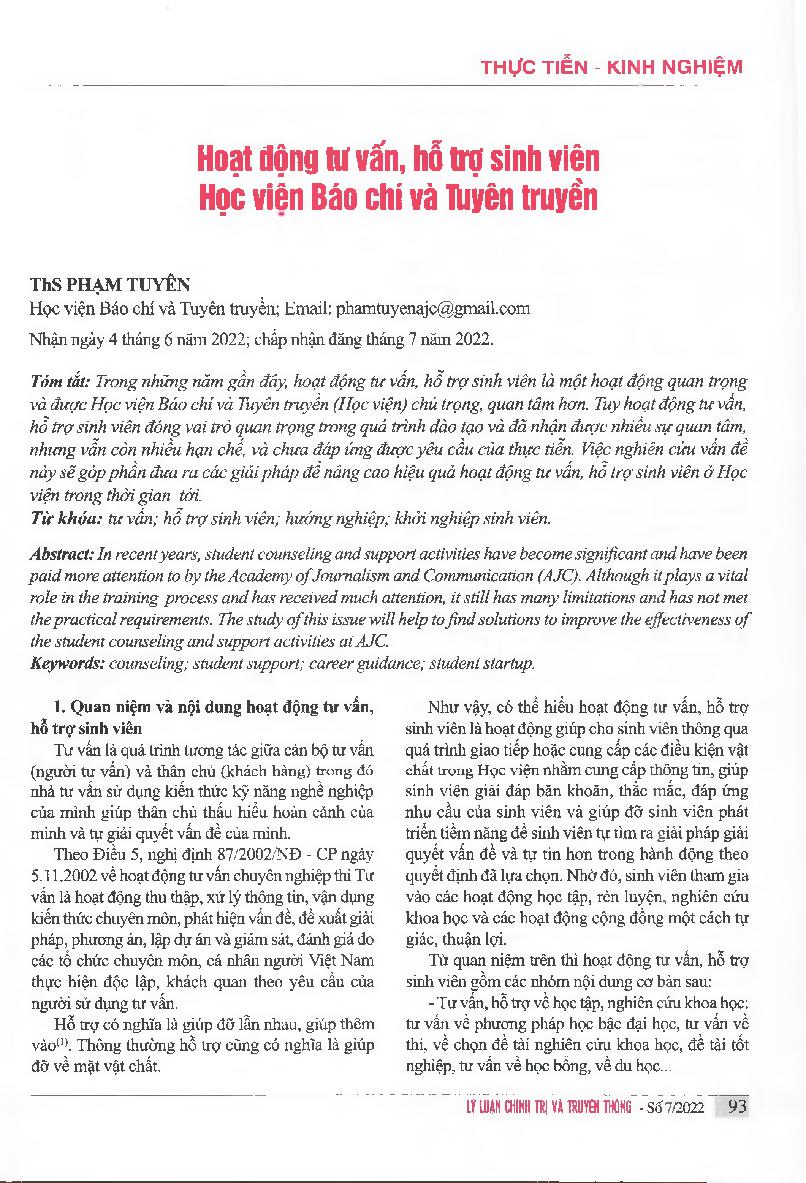 Hoạt động tư vấn, hỗ trợ sinh viên Học viện Báo chí và Tuyên truyền = Consulting and supporting activities for students of the Academy of Journalism and Communication